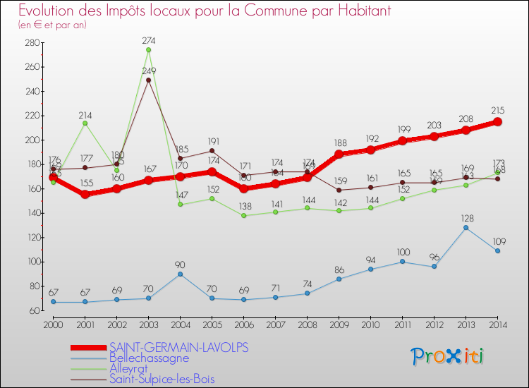 A Saint-Germain-Lavolps, les impôts locaux par habitant ont donc augmentés de 27.22 % entre 2000 et 2014.