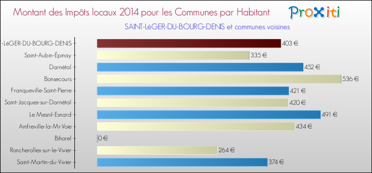 A noter : la valeur moyenne des impôts locaux dans les communes françaises similaires à Saint-Léger-du-Bourg-Denis était de 414 € par habitant, en 2014.