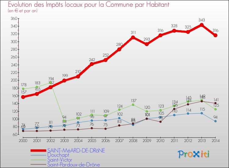 A Saint-Méard-de-Drône, les impôts locaux par habitant ont donc augmentés de 101.27 % entre 2000 et 2014.