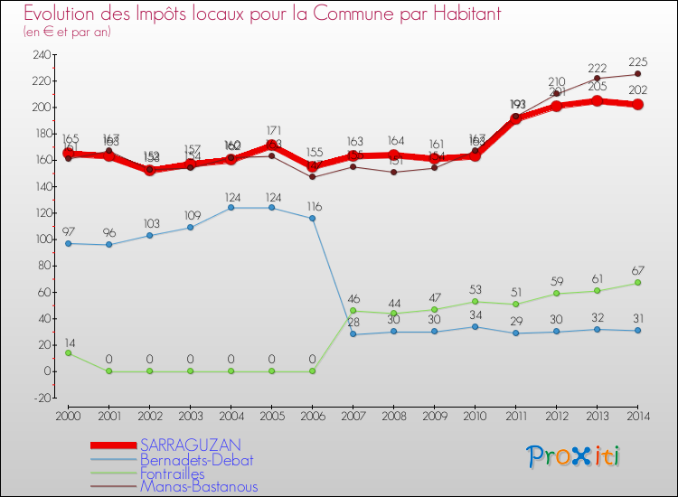 A Sarraguzan, les impôts locaux par habitant ont donc augmentés de 22.42 % entre 2000 et 2014.