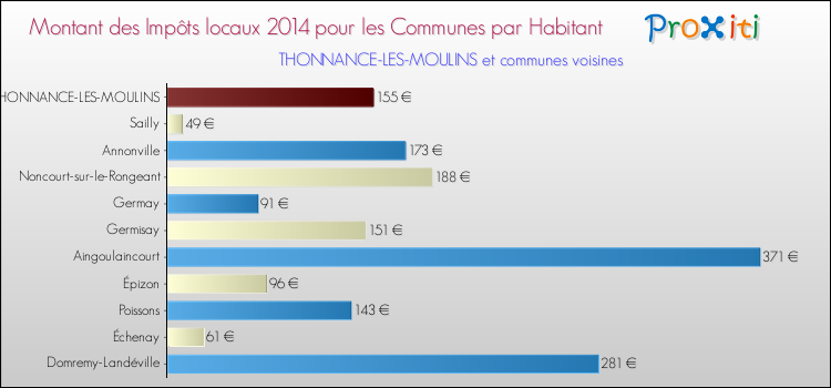 A Thonnance-les-Moulins, en 2014 les impôts locaux par habitant sont donc plus bas de 38 % que pour des communes similaires.