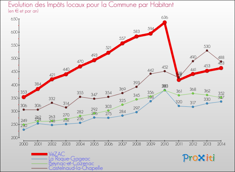 A Vézac, les impôts locaux par habitant ont donc augmentés de 31.16 % entre 2000 et 2014.