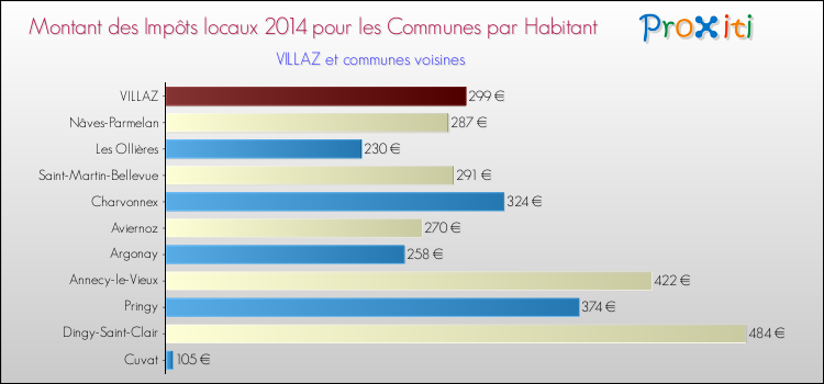 A noter : la valeur moyenne des impôts locaux dans les communes françaises similaires à Villaz était de 357 € par habitant, en 2014.