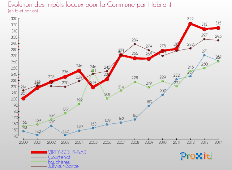 A Virey-sous-Bar, les impôts locaux par habitant ont donc augmentés de 56.72 % entre 2000 et 2014.