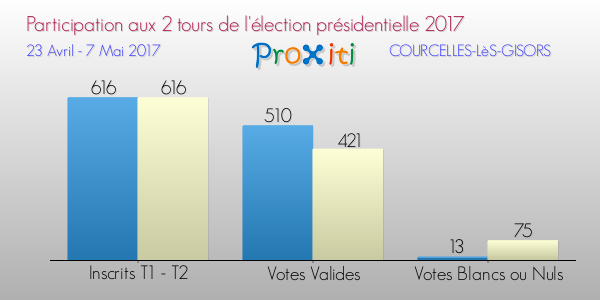 Sur 616 personnes inscrites au 1er tour à Courcelles-lès-Gisors, 523 se sont déplacées pour mettre leur bulletin dans l'urne, et 93 ne sont pas venues voter.