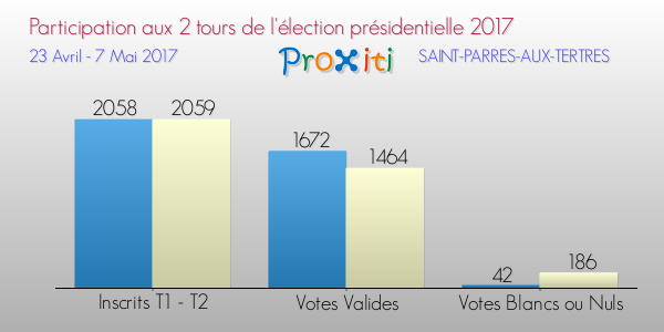 Sur 2058 personnes inscrites au 1er tour à Saint-Parres-aux-Tertres, 1714 se sont déplacées pour mettre leur bulletin dans l'urne, et 344 ne sont pas venues voter.