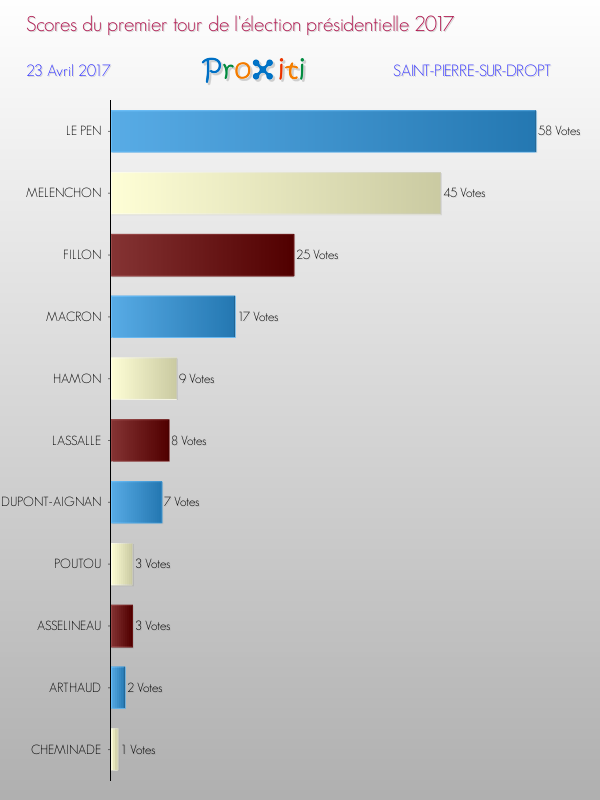 Sur 223 personnes inscrites au 1er tour à Saint-Pierre-sur-Dropt, 186 se sont déplacées pour mettre leur bulletin dans l'urne, et 37 ne sont pas venues voter.