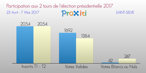 Sur 2054 personnes inscrites au 1er tour à Saint-Selve, 1734 se sont déplacées pour mettre leur bulletin dans l'urne, et 320 ne sont pas venues voter.