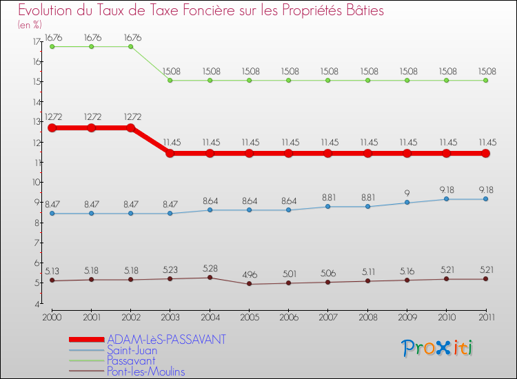 A Adam-lès-Passavant, le taux de taxe foncière sur le bâti a donc baissé de 9.98 % entre 2000 et 2011.