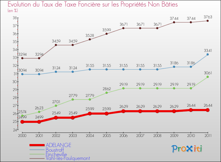 En 2011, le taux de la taxe foncière sur le non bâti vôté par le conseil municipal de Adelange était de : 26.44 %.