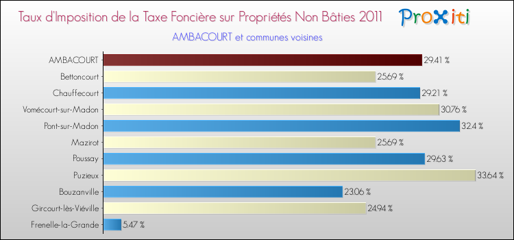 Vous trouverez ci-dessous des graphiques qui vous permettent de situer le taux de la taxe foncière sur le non bâti de Ambacourt par rapport aux communes voisines.