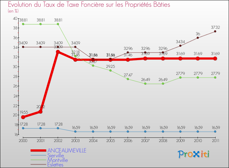 Le graphique ci dessous représente l'évolution du taux de la taxe foncière sur le bâti à Anceaumeville depuis 2000.