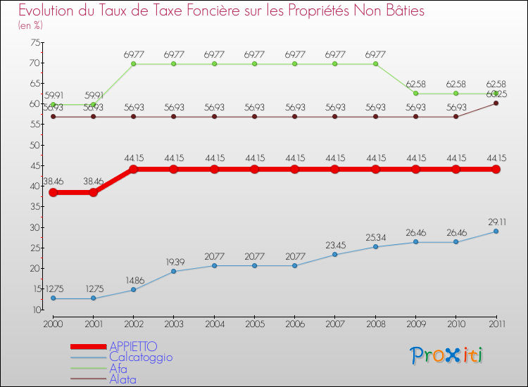 A Appietto, le taux de taxe foncière sur le non bâti a donc augmenté de 14.79 % entre 2000 et 2011.