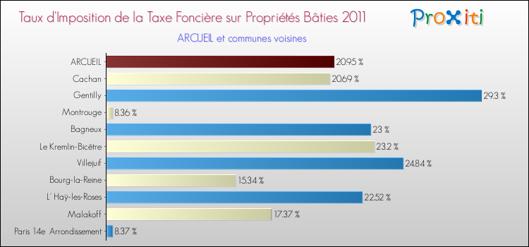 En 2011, le taux de la taxe foncière sur le bâti vôté par le conseil municipal de Arcueil était de : 20.95 %.