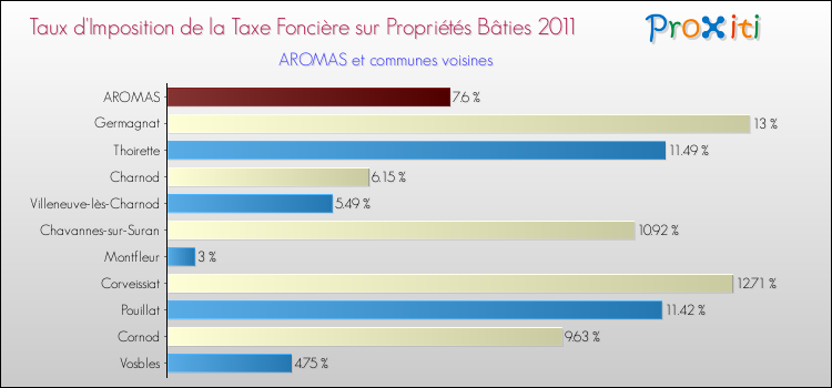Vous trouverez ci-dessous des graphiques qui vous permettent de situer le taux de la taxe foncière sur le bâti de Aromas par rapport aux communes voisines.