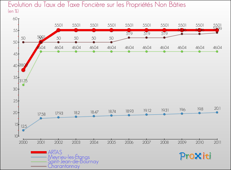 A Artas, le taux de taxe foncière sur le non bâti a donc augmenté de 44.65 % entre 2000 et 2011.