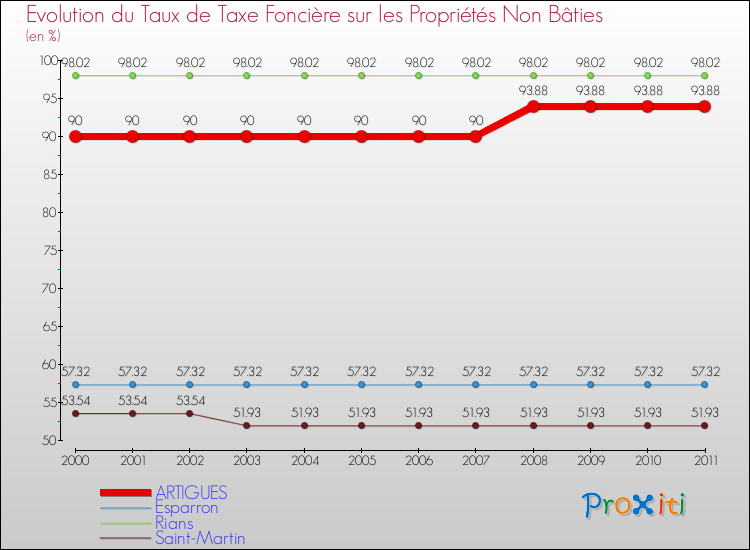 Pendant la même période, les communes françaises similaires à Artigues, ont vu leur taux de taxe foncière sur le non bâti augmenter de 26.73 % en moyenne entre 2000 et 2011.