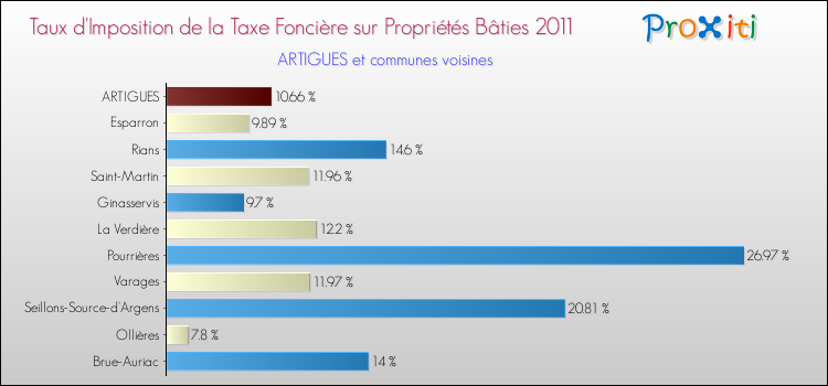 En 2011, le taux de la taxe foncière sur le bâti vôté par le conseil municipal de Artigues était de : 10.66 %.