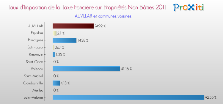 Pendant la même période, les communes françaises similaires à Auvillar, ont vu leur taux de taxe foncière sur le non bâti augmenter de 9.13 % en moyenne entre 2000 et 2011.