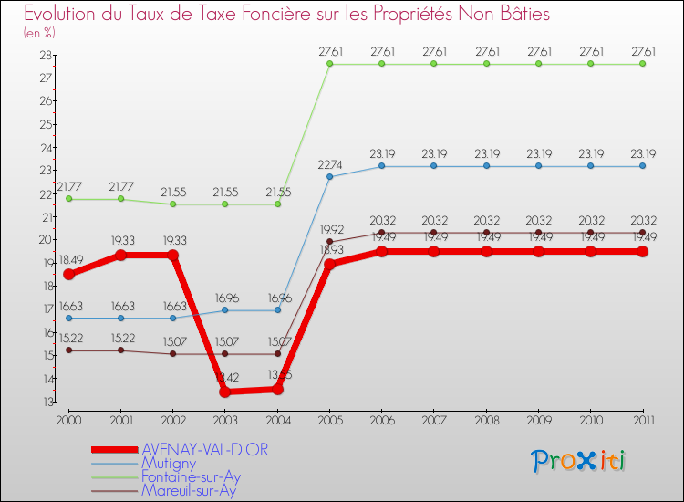 A Avenay-Val-d'Or, le taux de taxe foncière sur le non bâti a donc augmenté de 5.41 % entre 2000 et 2011.