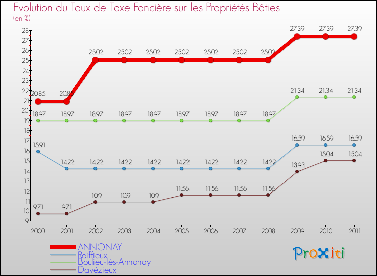 Pendant la même période, les communes françaises similaires à Annonay, ont vu leur taux de taxe foncière sur le bâti augmenter de 23.13 % en moyenne entre 2000 et 2011.