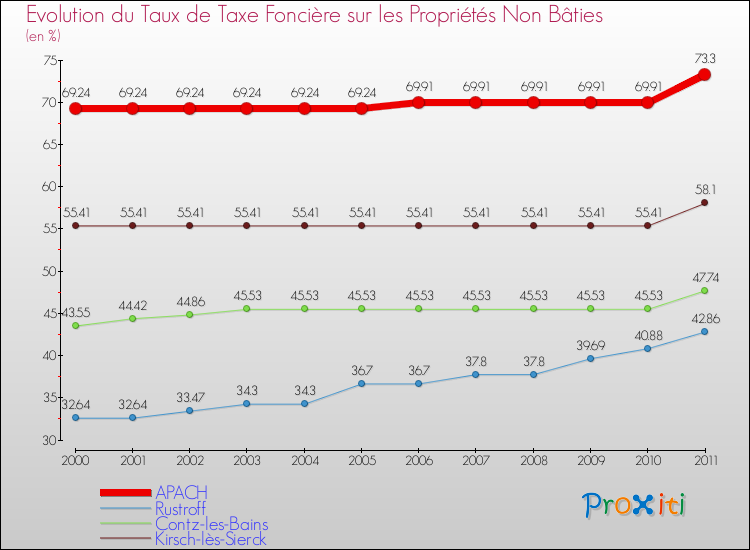 A Apach, le taux de taxe foncière sur le non bâti a donc augmenté de 5.86 % entre 2000 et 2011.