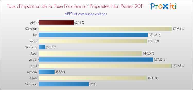 Vous trouverez ci-dessous des graphiques qui vous permettent de situer le taux de la taxe foncière sur le non bâti de Appy par rapport aux communes voisines.
