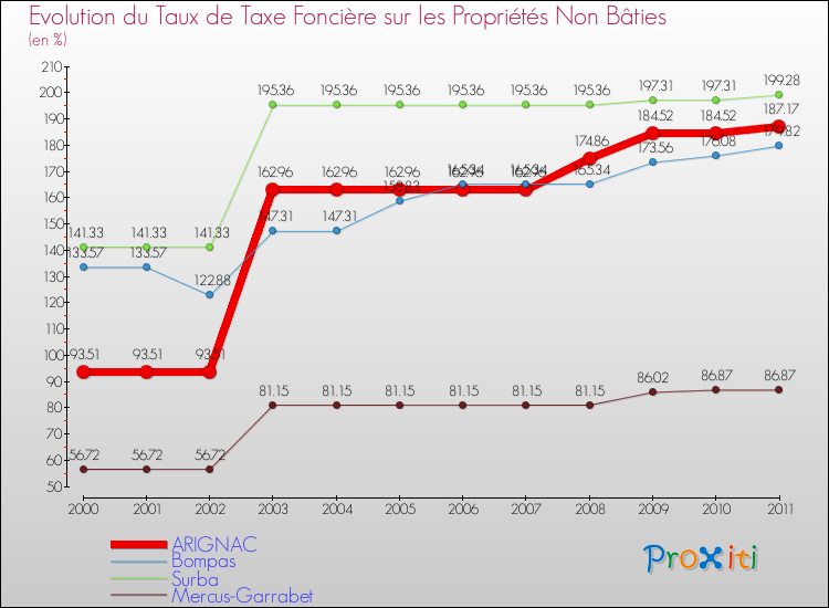 A Arignac, le taux de taxe foncière sur le non bâti a donc augmenté de 100.16 % entre 2000 et 2011.