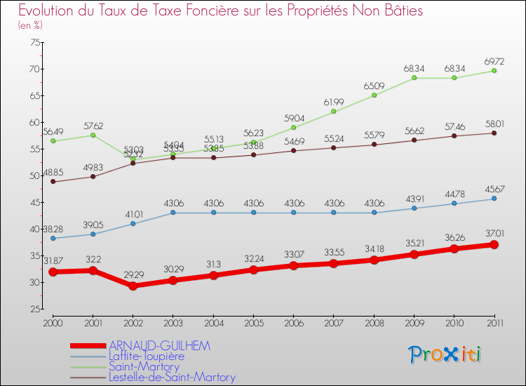 A Arnaud-Guilhem, le taux de taxe foncière sur le non bâti a donc augmenté de 16.13 % entre 2000 et 2011.