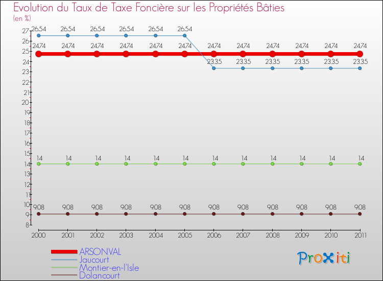 En 2011, le taux de la taxe foncière sur le bâti vôté par le conseil municipal de Arsonval était de : 24.74 %.