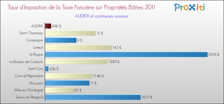 A noter : la valeur moyenne de ce taux de taxe foncière sur le bâti dans les communes françaises similaires à Audrix était de 11.86 %, en 2011.