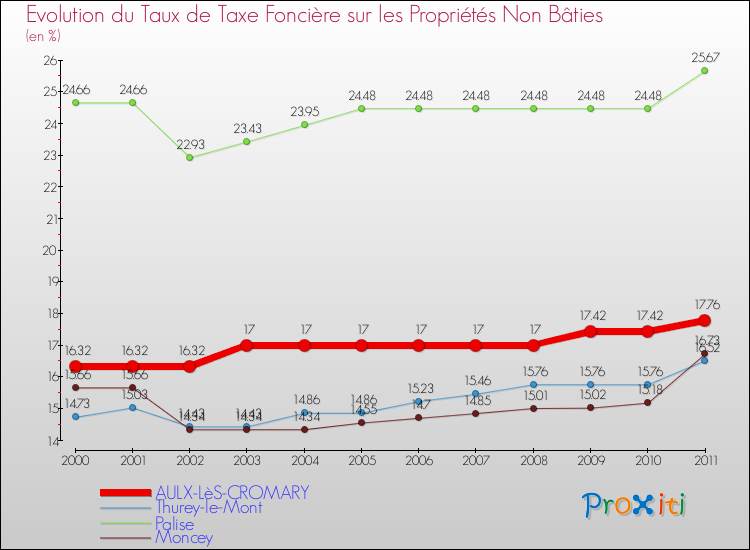 Pendant la même période, les communes françaises similaires à Aulx-lès-Cromary, ont vu leur taux de taxe foncière sur le non bâti augmenter de 26.73 % en moyenne entre 2000 et 2011.