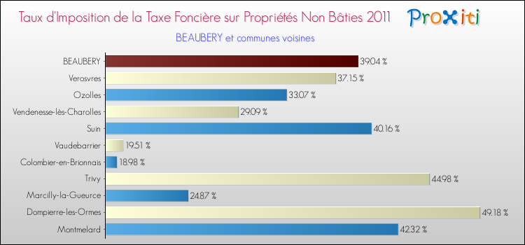 Vous trouverez ci-dessous des graphiques qui vous permettent de situer le taux de la taxe foncière sur le non bâti de Beaubery par rapport aux communes voisines.
