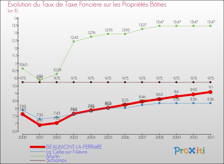 Pendant la même période, les communes françaises similaires à Beaumont-la-Ferrière, ont vu leur taux de taxe foncière sur le bâti baisser de 8.59 % en moyenne entre 2000 et 2011.