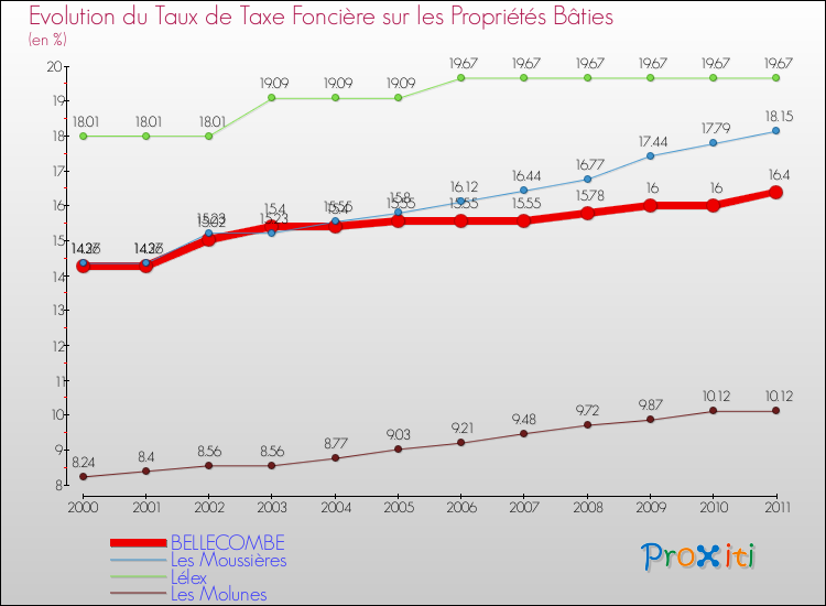 A noter : la valeur moyenne de ce taux de taxe foncière sur le bâti dans les communes françaises similaires à Bellecombe était de 13.59 %, en 2011.