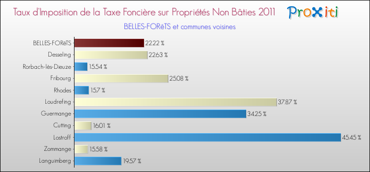 En 2011, le taux de la taxe foncière sur le non bâti vôté par le conseil municipal de Belles-Forêts était de : 22.22 %.