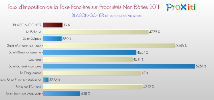 En 2011, le taux de la taxe foncière sur le non bâti vôté par le conseil municipal de Blaison-Gohier était de : 39 %.