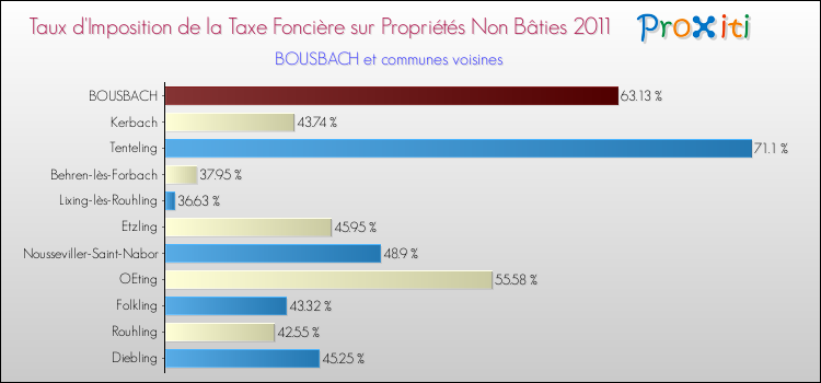 En 2011, le taux de la taxe foncière sur le non bâti vôté par le conseil municipal de Bousbach était de : 63.13 %.