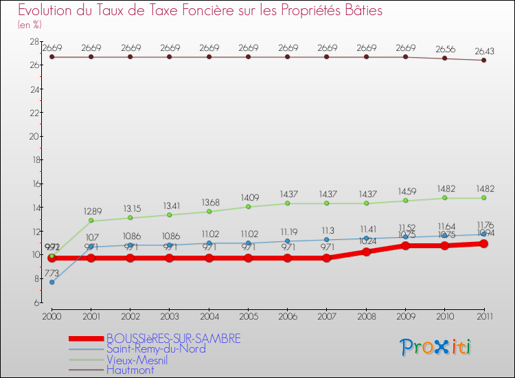 Pendant la même période, les communes françaises similaires à Boussières-sur-Sambre, ont vu leur taux de taxe foncière sur le bâti augmenter de 45.94 % en moyenne entre 2000 et 2011.