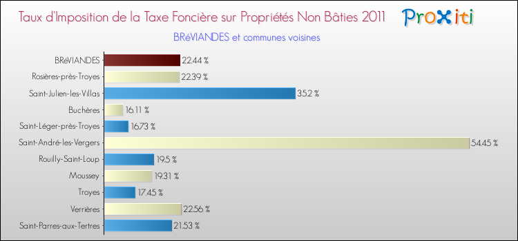 En 2011, le taux de la taxe foncière sur le non bâti vôté par le conseil municipal de Bréviandes était de : 22.44 %.