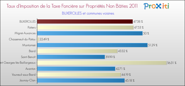 En 2011, le taux de la taxe foncière sur le non bâti vôté par le conseil municipal de Buxerolles était de : 47.38 %.