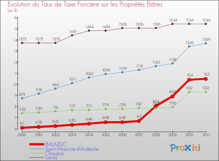Pendant la même période, les communes françaises similaires à Balazuc, ont vu leur taux de taxe foncière sur le bâti augmenter de 13.73 % en moyenne entre 2000 et 2011.