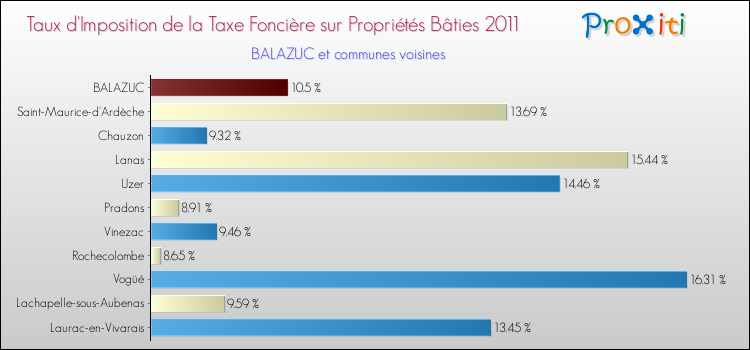 En 2011, le taux de la taxe foncière sur le bâti vôté par le conseil municipal de Balazuc était de : 10.5 %.