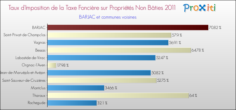 En 2011, le taux de la taxe foncière sur le non bâti vôté par le conseil municipal de Barjac était de : 70.82 %.