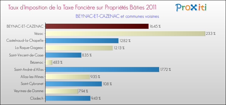 A noter : la valeur moyenne de ce taux de taxe foncière sur le bâti dans les communes françaises similaires à Beynac-et-Cazenac était de 15.82 %, en 2011.