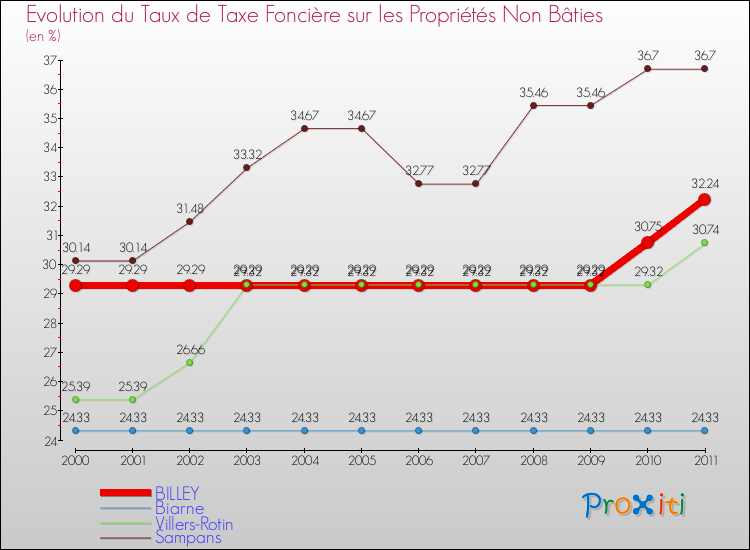 A noter : la valeur moyenne de ce taux de taxe foncière sur le non bâti dans les communes françaises similaires à Billey était de 25.53 %, en 2011.