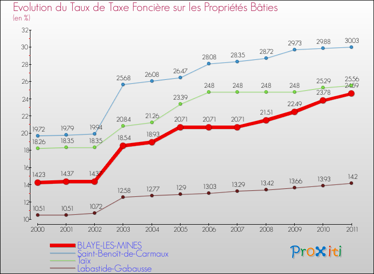 A Blaye-les-Mines, le taux de taxe foncière sur le bâti a donc augmenté de 72.8 % entre 2000 et 2011.