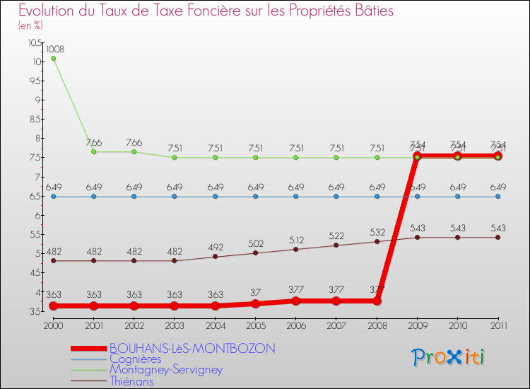 A Bouhans-lès-Montbozon, le taux de taxe foncière sur le bâti a donc augmenté de 107.71 % entre 2000 et 2011.