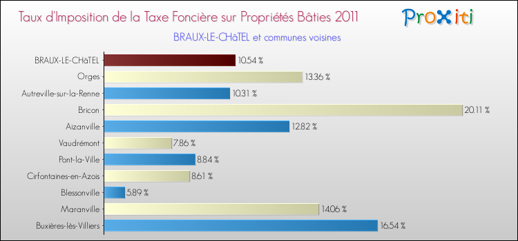 A noter : la valeur moyenne de ce taux de taxe foncière sur le bâti dans les communes françaises similaires à Braux-le-Châtel était de 10.11 %, en 2011.