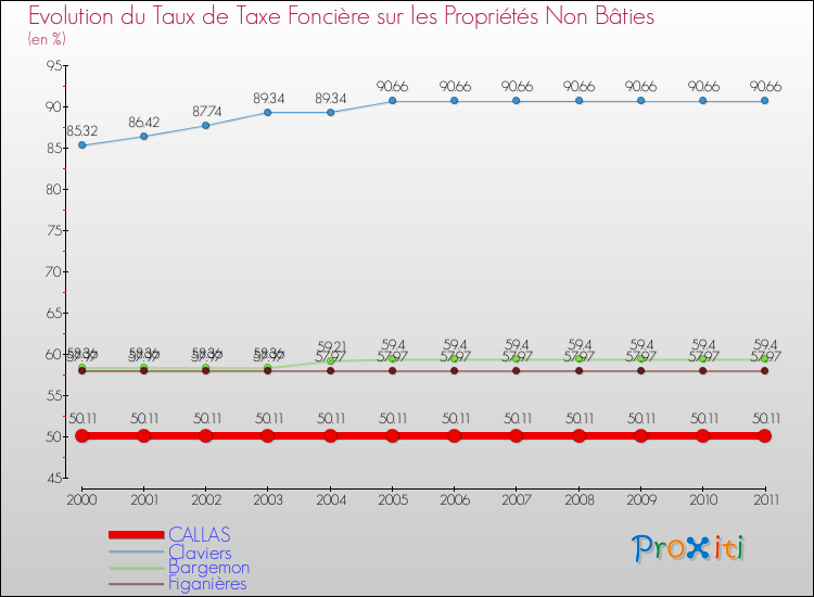 A Callas, le taux de taxe foncière sur le non bâti a donc augmenté de 0 % entre 2000 et 2011.